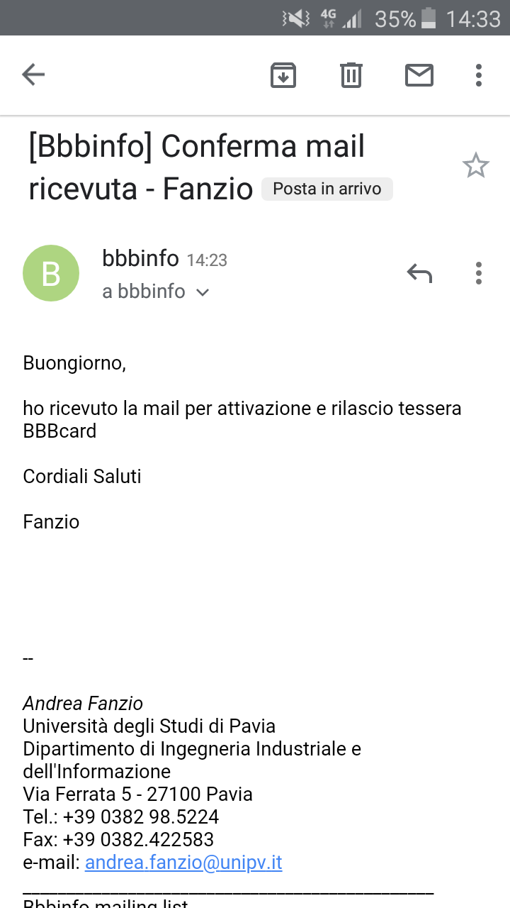 >> ho ricevuto la mail per attivazione e rilascio tessera BBBcard